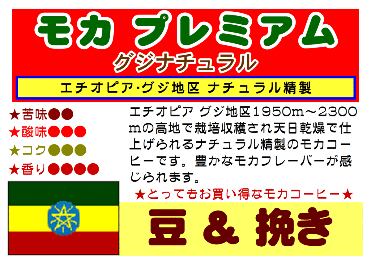 《4月のおすすめ!》モカプレミアム グジナチュラル 販売価格 573円(税込み) 会員価格 (税込み) 通常価格 637円(税込み) 在庫 商品コード JANコード 100g 挽き 100g 豆 200g 挽き 200g 豆 300g 挽き 300g 豆 500g 挽き 500g 豆 数量 - + カートに入れる カテゴリー モカコーヒー豆 メーカー 加賀コーヒー店 ブランド 大館焙煎珈琲 便種 宅急便 ツイートする シェアする