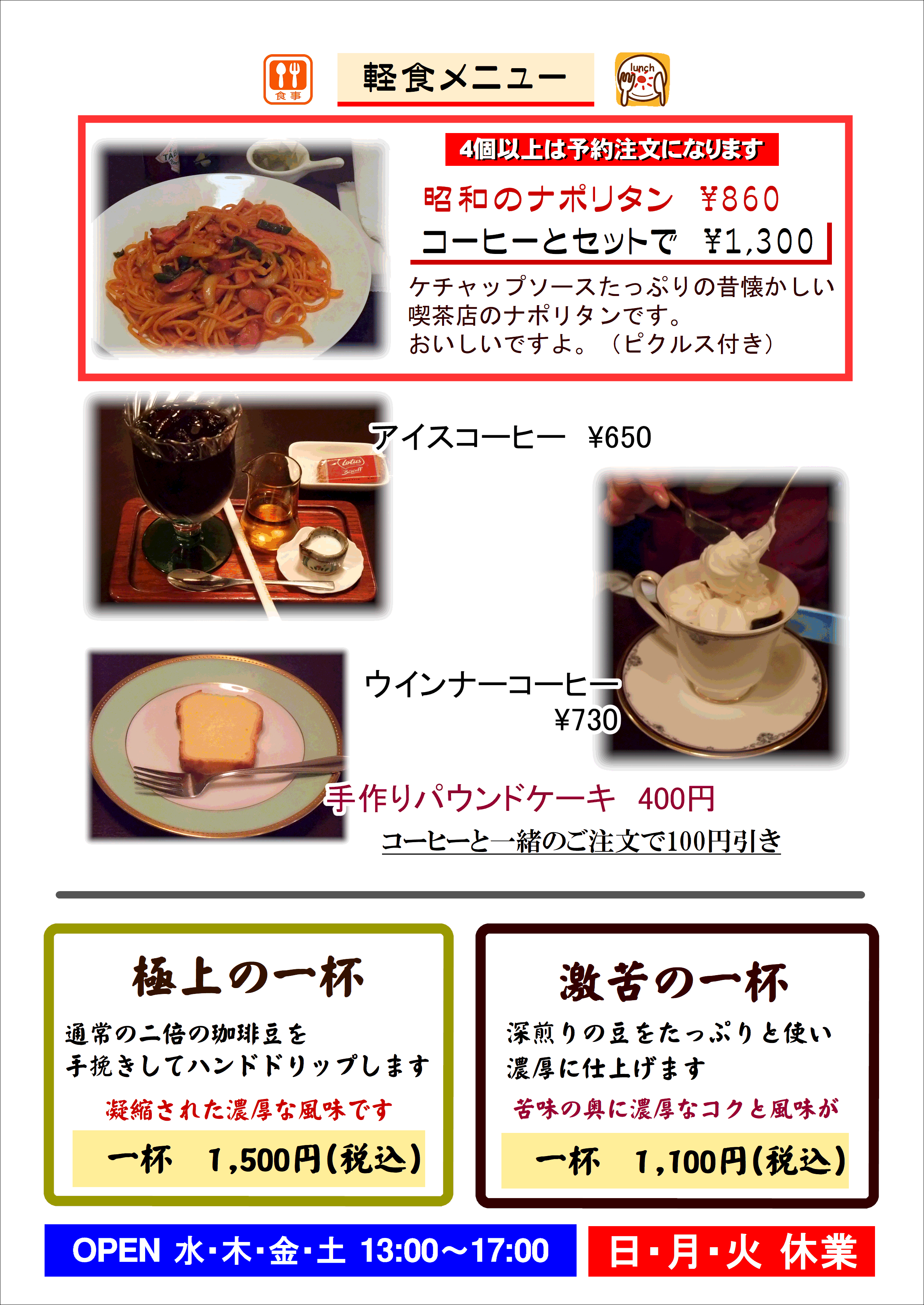 お知らせ 軽食メニューの「昭和のナポリタン」を1度に4個以上のご注文のお客様は前日営業日までの予約注文をお願いいたします。